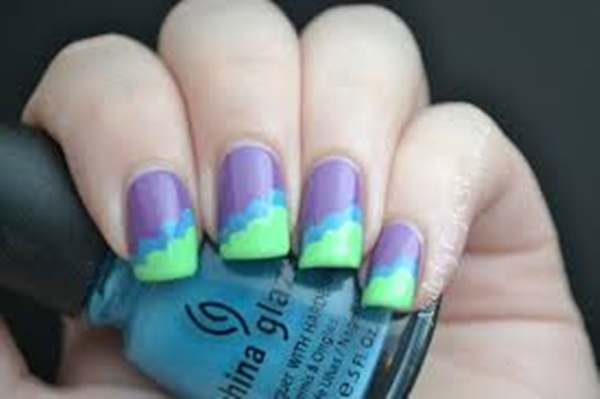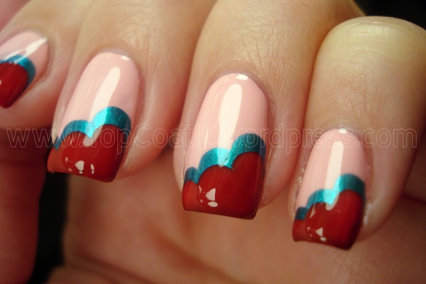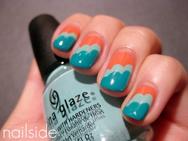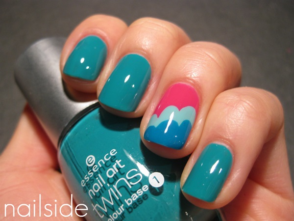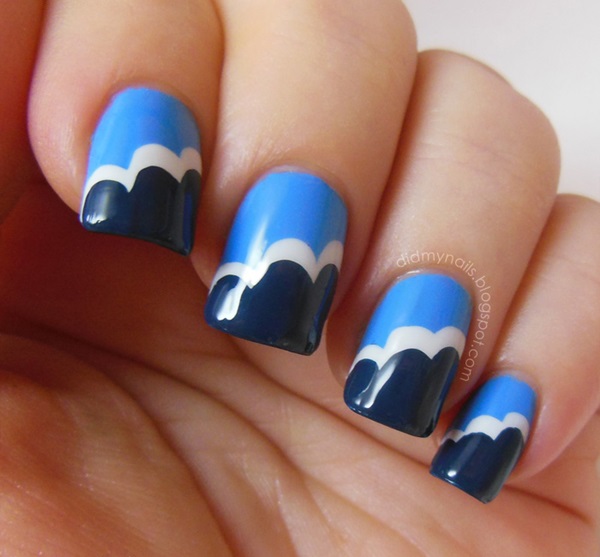 HOW TO : ลายเล็บก้อนเมฆเฉียงนี้ ความกว้างของหยักก้อนเมฆจะเท่ากันความกว้างของพู่กันยาทาเล็บ เวลาเราทาเล็บลายนี้ ก็ไม่ต้องทำอะไรมากค่ะ จุ่มยาทาเล็บแล้วทาลงไปตรงๆ ทีละแถว โดยให้แต่ละแถวต่ำลงมาจากแถวแรกสักเล็กน้อย ทำเช่นนี้จนครบหน้ากว้างของเล็บเรา รอจนแห้งแล้วค่อยทำใหม่อีกชั้น โดยใช้สียาทาเล็บอีกสี และให้ความสูงของพู่กันที่ทาลงไปนั้นลดต่ำลงมาเล็กน้อยจากสีแรก เท่านี้เองค่ะ