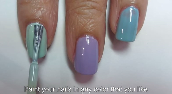 STEP 1 ทาสีเล็บด้วยสีพาสเทลที่เตรียมไว้ โดยทาสีละเล็บ (หรือหากใครต้องการใช้สีเดียวกันทุกเล็บก็ได้แล้วแต่ความชอบเลยค่ะ)