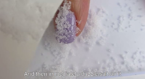 STEP 4 เอากระดาษอีกใบ ตักเกลือขึ้นมาแล้วค่อยๆ เทลงไปบนเล็บให้ทั่ว