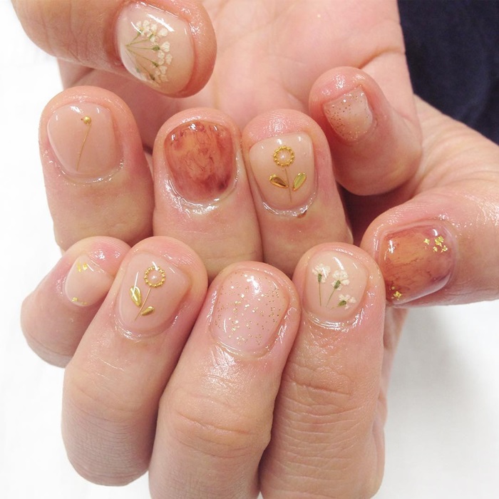 image source : instagram @kuukinailซึ่งที่จริงแล้ว ไอเดียนี้เป็นการทำเล็บที่สาวๆ เองก็สามารถทำตามได้ไม่ยากนะคะ วิธีทำคือ ทาเล็บสีพื้นด้วยยาทาเล็บสีอ่อนๆ หรือ สีใส จากนั้นก็เคลือบทับด้วย Top Coat ให้ดูแวววาว เงางาม จัดรูปดอกไม้ในตำแหน่งต่างๆ ที่แตกต่างกันออกไปในแต่ละเล็บ ดูแล้วน่ารักสุดๆ ทั้งสวยหวานและอ่อนโยน ว่าแล้วตามเรามาชมไอเดียกันเลย ชอบลายไหน ก็เก็บไว้เป็นแรงบันดาลใจในการทำเล็บสวยๆ ให้กับตัวเองกันดูนะ