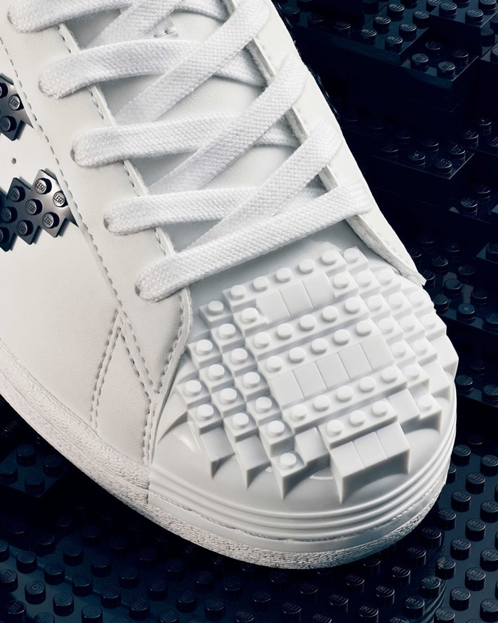 โดยทางฝั่ง adidas Orignals มากับรองเท้าผ้าใบ รุ่น LEGO Superstar ที่ดึงความโดดเด่นของทั้งสองแบรนด์เข้ามาไว้ด้วยกัน โดยคงเอกลักษณ์ของความเป็นรองเท้ารุ่น Superstar ในโทนสีขาวดำสุดคลาสสิก แต่เพิ่มดีเทลล์ที่สื่อถึงความเป็น LEGO ในหลายๆ จุด ทั้งแถบ 3 แถบ ส่วนหัวรองเท้า (Shelltoe) และส่วนส้นเท้า (Heel Tab) ที่มีลวดลาย LEGO Brick