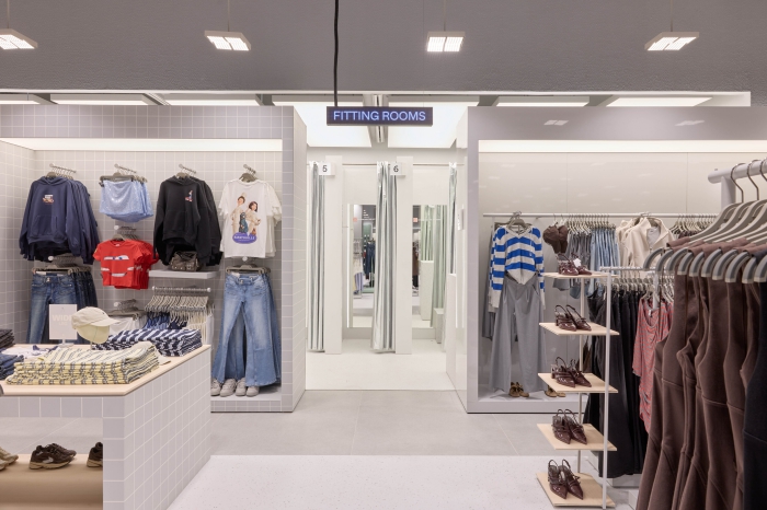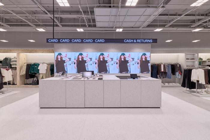 ในส่วนของพื้นที่ให้บริการลูกค้า ห้องลองสินค้า และเคาน์เตอร์ชำระเงิน ได้รับการออกแบบอย่างพิถีพิถัน เนื่องจากเป็นองค์ประกอบสำคัญของประสบการณ์ภายในร้าน โดยโซนชำระเงินถูกออกแบบเป็นชิ้นงานไม้เชิงประติมากรรมในลักษณะบล็อกขนาดใหญ่ จัดวางเสมือนเกาะที่โดดเด่นภายในพื้นที่ พร้อมรองรับทั้งเคาน์เตอร์ชำระเงินแบบปกติและแบบบริการตนเอง ช่วยเพิ่มความคล่องตัวในการใช้งาน ส่วนพื้นที่ห้องลองสินค้า ถูกออกแบบให้มีโครงสร้างส่วนกลางที่โอบล้อมพื้นที่ทั้งหมด กลายเป็นองค์ประกอบที่มีเอกลักษณ์และโดดเด่นทางสายตา สร้างภาพจำให้กับร้านได้อย่างชัดเจน