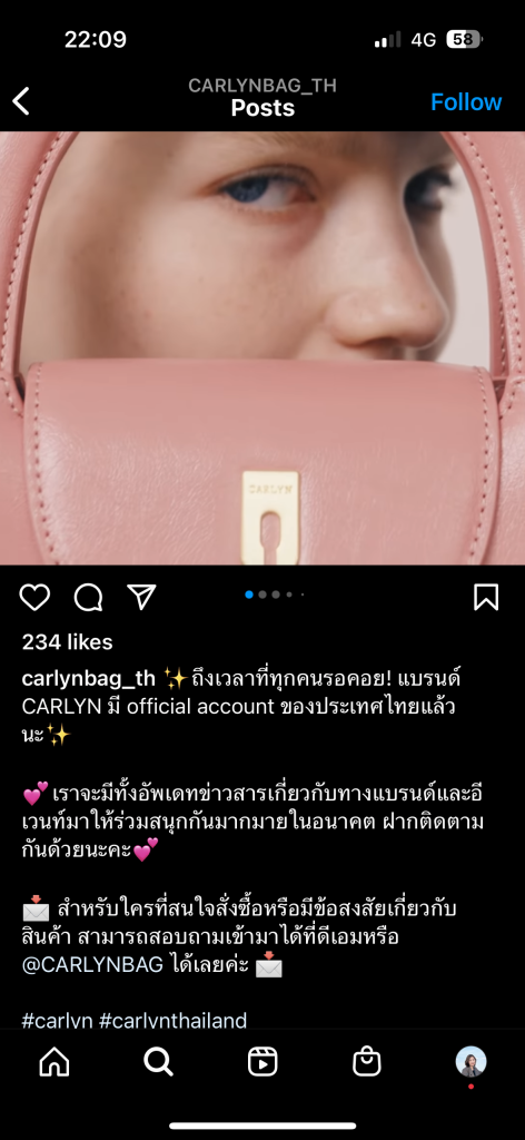 ล่าสุดมีลุ้นอาจจะเข้าไทยรึเปล่านะ เพราะเมื่อวันก่อน (19 มกราคม) เล่น IG อยู่ดีๆ ก็ลองเสิร์ชหาไอจีของแบรนด์ Carlyn Bag ดูอัพเดทกระเป๋าฮิตสักหน่อย ปรากฏว่าเจอการสร้างไอจีในชื่อ carlynbag_th เมื่อวันที่ 19 มกราคมขึ้นมาพอดี และอัพเดทเช้านี้ก็มีรูปโปรไฟล์โผล่มา คาดว่าเพิ่งอัพเดทเมื่อไม่นานมานี้ แถมในไอจีนี้ยังได้มีการ follower เป็นของ IG official ของแบรนด์ที่มากดติดตามไว้ด้วย ขณะเดียวกัน Following ก็มีกดติดตามเพียงแค่อินสตาแกรมของแบรนด์เท่านั้นด้วย แบบนี้ใครที่กำลังรอพรี หรือ หาพรีกันอยู่ อาจจะมีลุ้น รึเปล่านะ