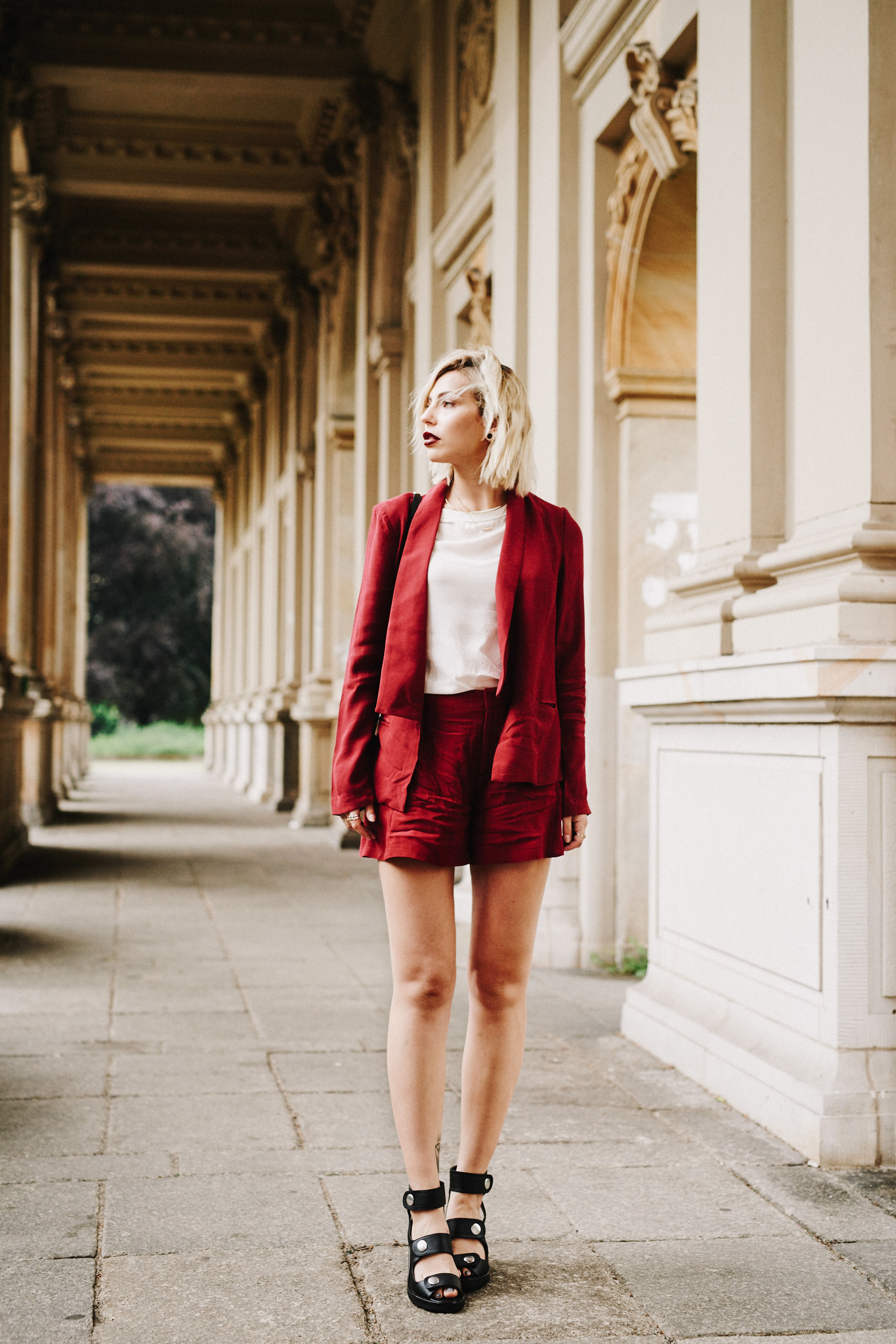 #8 ลุค Working Woman ในแจ๊กเกตและกางเกงขาสั้นสีแดง