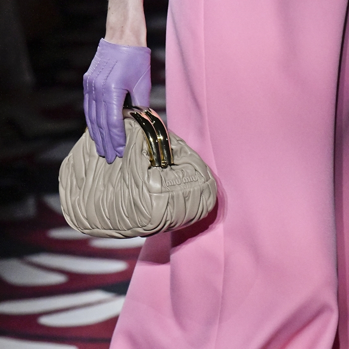 มิเพียงเท่านั้น กระเป๋ามิว มิว รุ่น Miu Belle โดดเด่นด้วยโครงกรอบโลหะสีทองและตัวล็อคกระเป๋าสีดำมันวาว เชื่อมรายละเอียดระหว่างความทันสมัยกับเสน่ห์ของความดั้งเดิมได้อย่างแยบยล ดีไซน์นั้นแฝงไว้ทั้งความเฟมินีนและความแข็งแกร่ง เต็มไปด้วยความหมายกับความสนุกสนาน ความโค้งมนและความแข็งแรงของกรอบโลหะตัดกันอย่างลงตัวกับลวดลายของหนัง Matelassé อันอ่อนช้อย