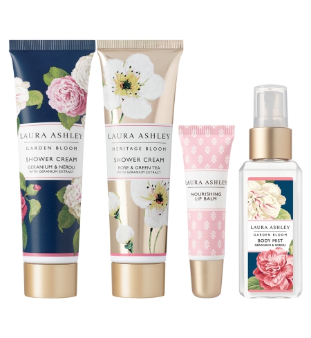 ปรนนิบัติผิวพร้อมกลิ่นหอมจากดอกไม้ ในเซตประกอบด้วย ครีมอาบน้ำกลิ่นการ์เด้น บลูม และกลิ่นเฮอริเทจ บลูม (ชิ้นละ 50 มล.) บอดี้มิสต์ กลิ่นการ์เด้น บลูม (50 มล.) และลิปบาล์ม (10 มล.) บรรจุในกล่องลายดอกไม้สวยหรู